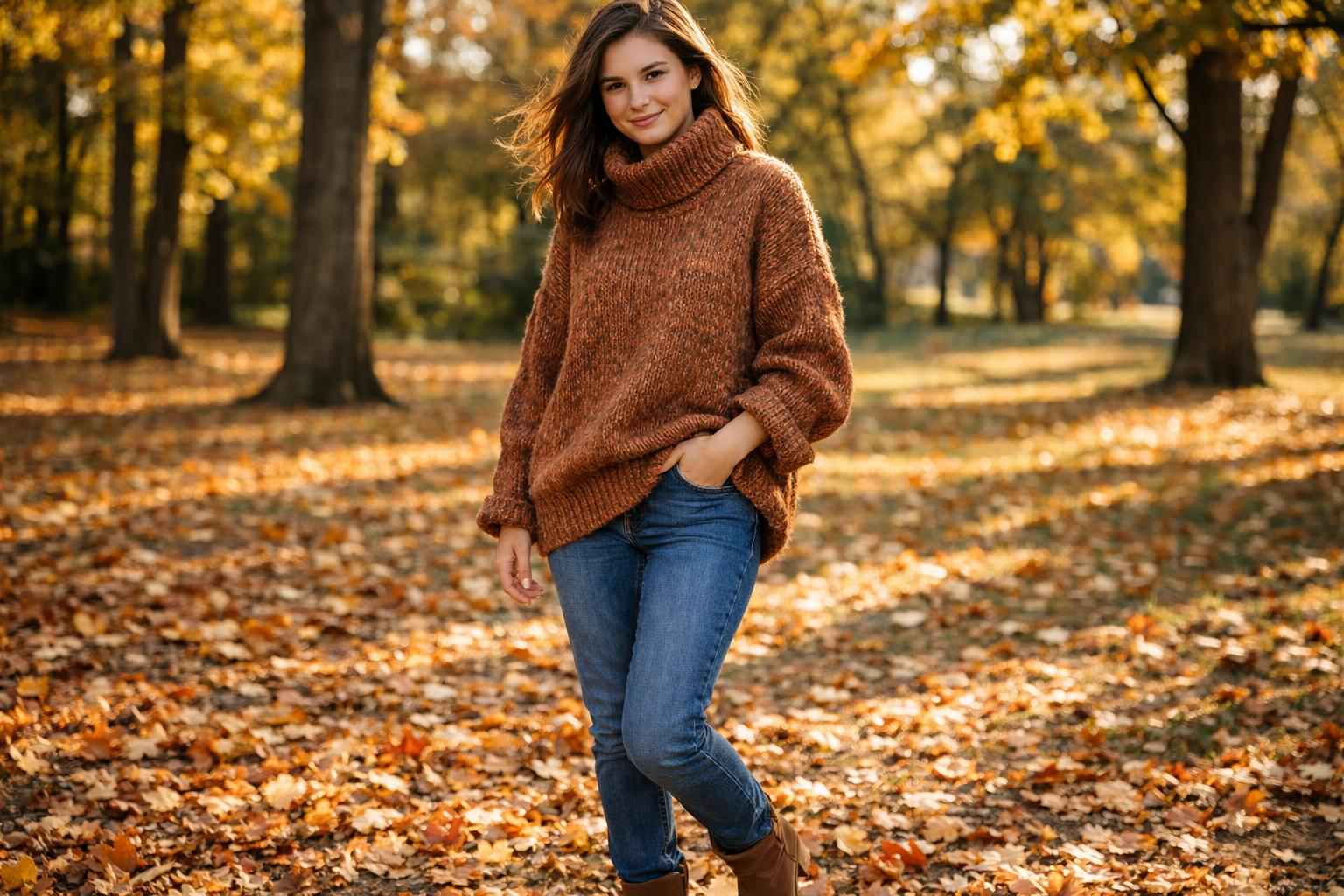 - Sweter oversize + jeansy + sneakersy – wygodny look na co dzień.